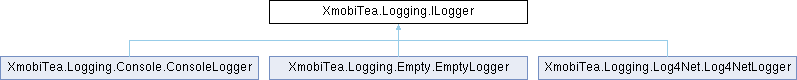 XmobiTea.Logging.Console.ConsoleLogger XmobiTea.Logging.Empty.EmptyLogger XmobiTea.Logging.Log4Net.Log4NetLogger
